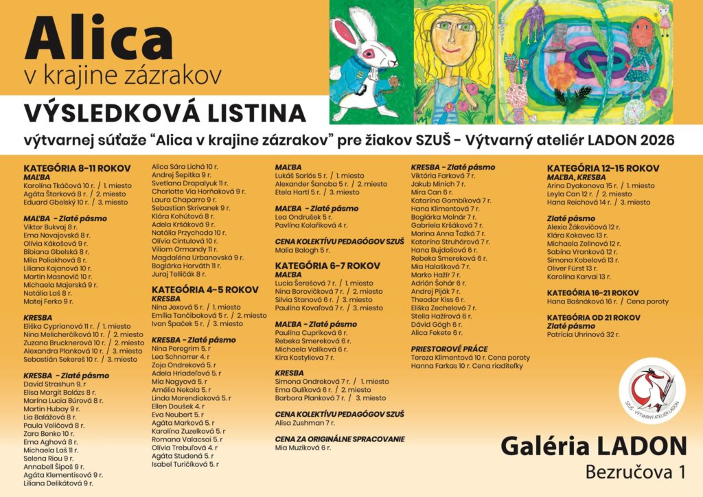 S radosťou zdieľame výsledky výtvarnej súťaže „Alica v krajine zázrakov“, do ktorej sa zapojili žiaci SZUŠ – Výtvarný ateliér LADON. Súťaž prebiehala v rôznych vekových kategóriách a disciplínach.