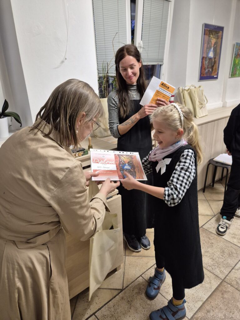 Súčasťou vernisáže bolo aj slávnostné odovzdávanie cien víťazom našej súťaže. Bolo úžasné vidieť radosť a hrdosť v očiach ocenených tvorcov. Ešte raz srdečne gratulujeme všetkým oceneným a ďakujeme každému jednému účastníkovi za to, že sa s nami podelil o svoj jedinečný pohľad na príbeh Alice.